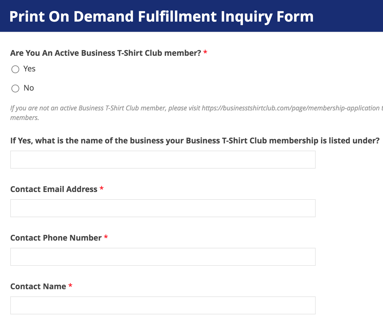 Business T-Shirt Club offers print on demand fulfillment services inclusive of a custom e-commerce website featuring your logos and designs. This service and website is a members only service hosted & maintained by Business T-Shirt Club. Our print on demand fulfillment service with custom e-commerce website is ideal for fundraising, merchandising and streamlined corporate apparel ordering for your staff. Please complete the form below to be contacted by an account manager for more details.
